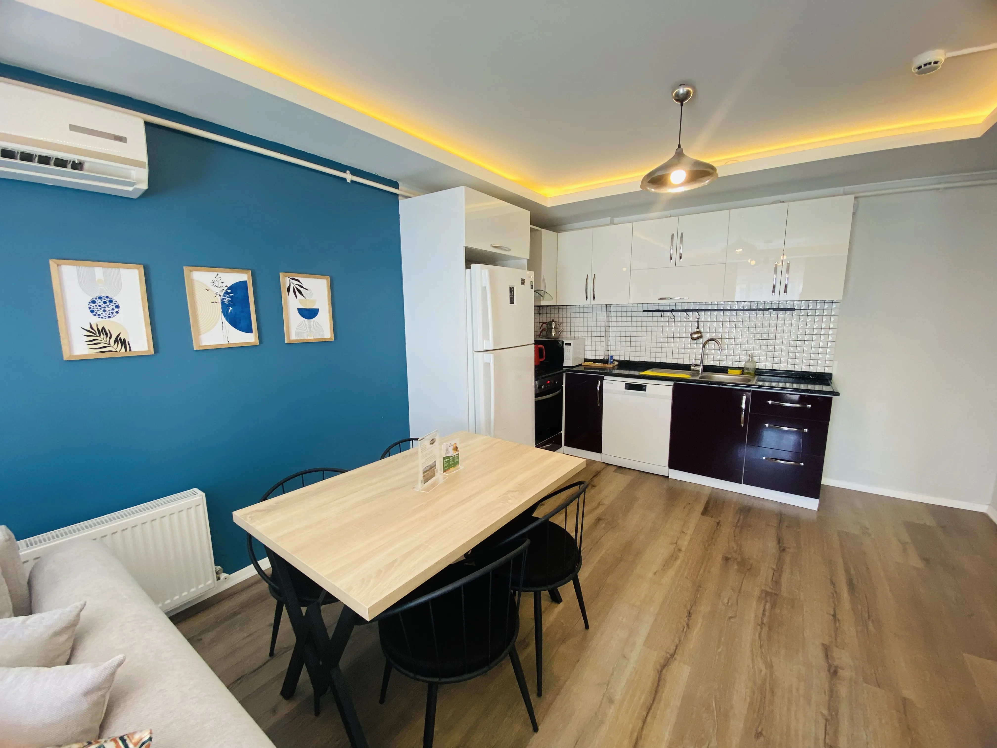 Dairelerimiz ücretsiz wi-fi, klima, doğalgaz, tv, tam donanımlı mutfak, bulaşık - çamaşır makinası, buzdolabı, fırın, mikrodalga, çay/kahve makinası, tost makinası, ütü, kişisel hijyen ürünleri - havlu vb ihtiyaç duyabileceğiniz tüm eşyalara sahiptir.